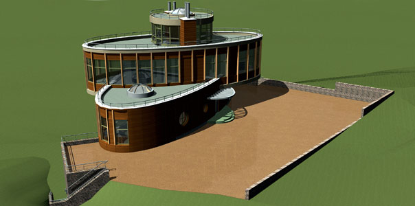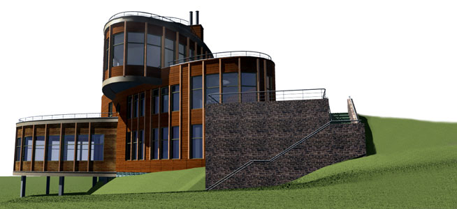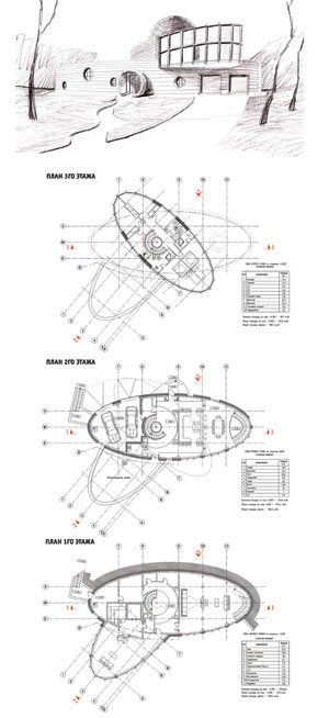 Про "Атом", проект дома наш любимый клиент, заказал нам сразу после того как мы спроектировали ему "круглую квартиру" http://pics.livejournal.com/wervolk/pic/000268sp/g51, творить вместе нам понравилось и он поставил нам задачу придумать дом без острых углов, с природным началом, органичной формы и человеческого пространства, было много вариантов, спирали, ракушка, кольцо мёбиуса, лента. Участок в который он влюбился однажды увидев в коттеджном посёлке под Одинцово оказался привлекательным и сложным для работы одновременно, ввиду активного рельефа ниспадающего от въезда к дальним его рубежам, всю историю существования посёлка он не застраивался и использовался местными под свалку мусора. При этом после расчистки мусора и вырубки паразитных кустарников открылась сумасшедшая перспектива на холмы с другой стороны мини речушки текущей на границе участка в низине и растущие вокруг берёзы очень нас вдохновили на подвиги. Дом имеет три объёма, в плане прочитывается троектория электронов вращающихся вокруг, ядра (в нашем случае, лестничного столба). Конечно если быть честным то это скорее молекула, а не атом, но уже как-то сложилось так. Центральный объём "земляной" всмысле того что стоит на земле и имеет разную высоту фасада от въезда и внутри участка из-за рельефа, а два других объёма накладываются на него и врезаются. Лестничный столб увенчан на последнем этаже кабинетом хозяина с периметральным обзором. На среднем уровне расположены прихожая-холл главного входа, блок кухни с местом для завтрака и баром, столовая технический санузел, гараж и двухсветное пространство ведущее на нижний уровень. |