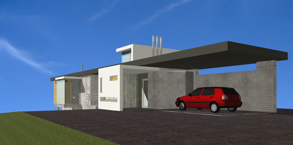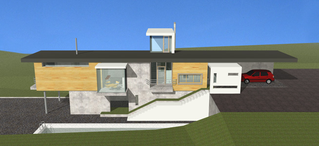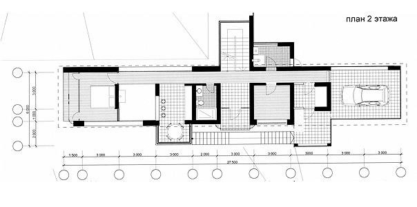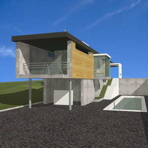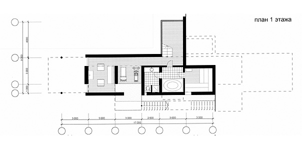 КОНЦЕПЦИЯ: Здание представляет собой бетонный вытянутый параллелепипед. Перпендикулярно расположено несколько модулей, отделанных разными материалами и различающихся функционально. Так, при помощи выступающего оштукатуренного навеса создается «воздушный объем» и организуется входная зона, за которой следует деревянный модуль — жилой блок. Он отличается от общих помещений, в отделке которых используется строгий прохладный бетон. Другой модуль в центральной части дома пересекается небольшой балкон, с другой — выступает и создает пространство для лестницы. |