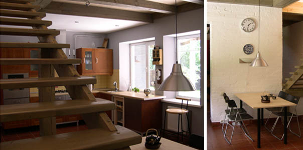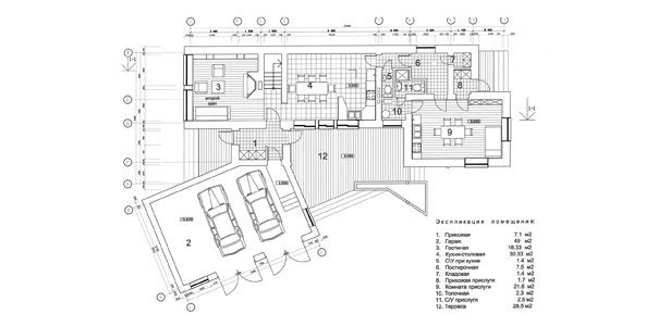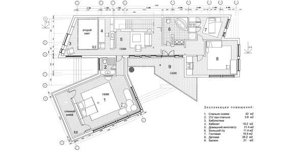 На участке неправильной формы планировалось построить дом для постоянного проживания семьи из трех человек. Причем строение необходимо было не просто вписать в окружающий контекст, но аккуратно разместить между тремя старыми елями и забором соседей. Именно этим обстоятельством и было обусловлено трехчастное деление дома и асимметричная его конфигурация. В процессе строительства, уже после закладки фундамента, выяснилось, что деревья старые и стволы внутри полые, поэтому сохранить ели не было никакой возможности и они подлежали спилу. Однако благодаря фантазии архитектора еловые стволы обрели вторую жизнь, став оригинальной опорой для балкона и украшением террасы. Соседний дом построен практически вплотную к забору, и чтобы изолировать жизнь обитателей коттеджа от посторонних взглядов, пришлось ориентировать все окна в доме в сторону участка. Кроме того, такое решение позволило справиться с проблемой инсоляции помещений. На участке много высоких крупномеров, елей и сосен, лиственниц и берез, поэтому он затенен. Размещение всех окон с южной стороны позволяет солнечному свету проникать в разные помещения дома практически целый день. |
