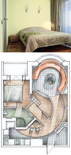 Прямые углы редко встречаются в природе, где все стремится к плавности линий. К тому же округлые формы наиболее органично воспринимаются человеком. В типовой однокомнатной квартире архитектор создал планировку на первый взгляд несколько непривычную, но зато гармоничную по формам. Именно благодаря ей удалось рационально использовать столь небольшую площадь.
