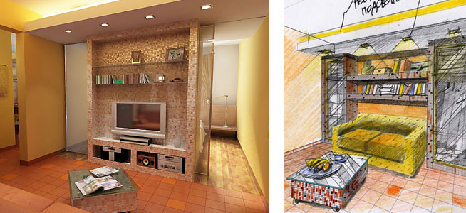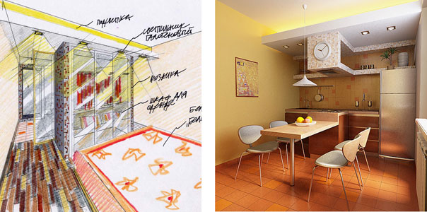 На пол во всех помещениях, кроме спальни, кладется керамогранит терракотово-охристого оттенка. А во избежание монотонности керамогранит используется неоднородный по тону, с красивой текстурой. В целом квартира решается на сочетании золотисто-белой мозаики и желто-оранжевой покраски стен. Все это складывается в картину теплого вечера в какой-нибудь южной стране. |