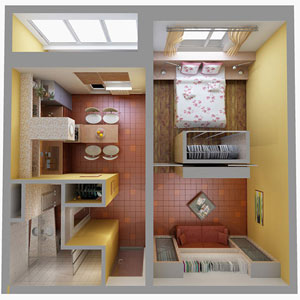 В санузле справа от входа предлагается расположить унитаз, напротив двери - умывальник, встроенный в столешницу, под которой найдется место и для стиральной машины. Слева от двери, в нише, выступающей в прихожую, устанавливается душевая кабина. Некоторые люди предпочитают душ ванне, и этот проект рассчитан именно на них, энергичных и спортивных (молодую чету или одного хозяина). Стены санузла покрываются белой плиткой и мозаикой медового оттенка.